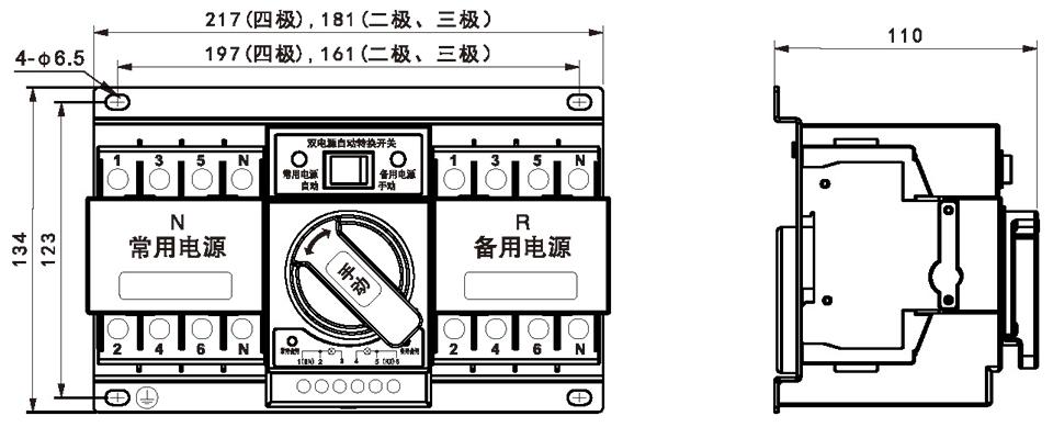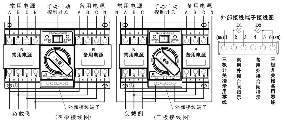 将常用供电电源接入常用电源执行断路器 N的进线侧,备用供电电源接入备用电源执行断路器QR的进线侧。注:若断路器选用为三极时,则按(三极接线图)接线,必须将常用电源的零线N接到“1(NN)”接线端子备用电源的零线N接到“6(RN)”接线端子上。两路执行断路器的出线侧并接输出接负载侧。如图: