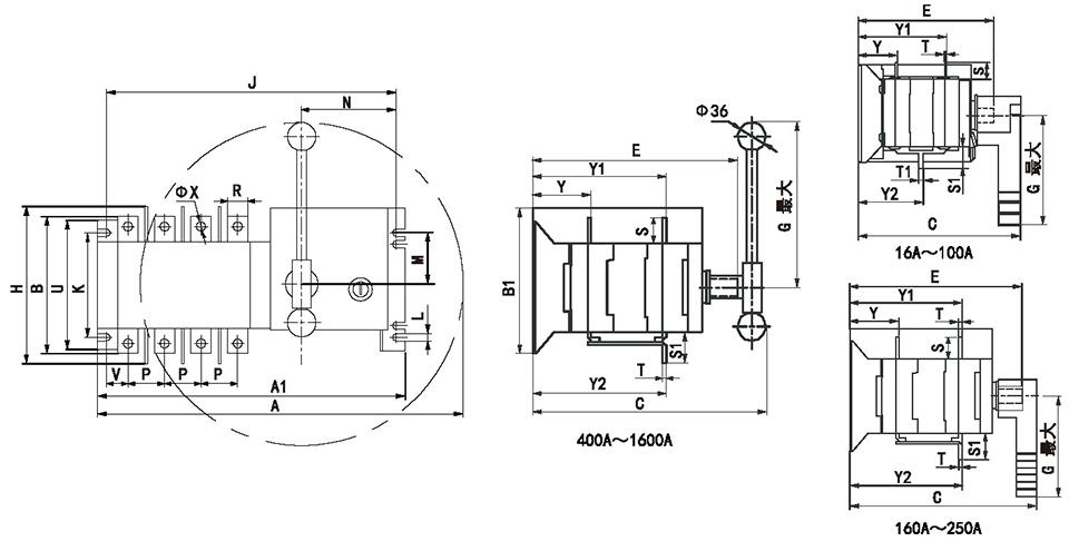 | 额定发热电流Ith(A) | 100 | 160 | 250 | 400 | 630 | 1600 | |