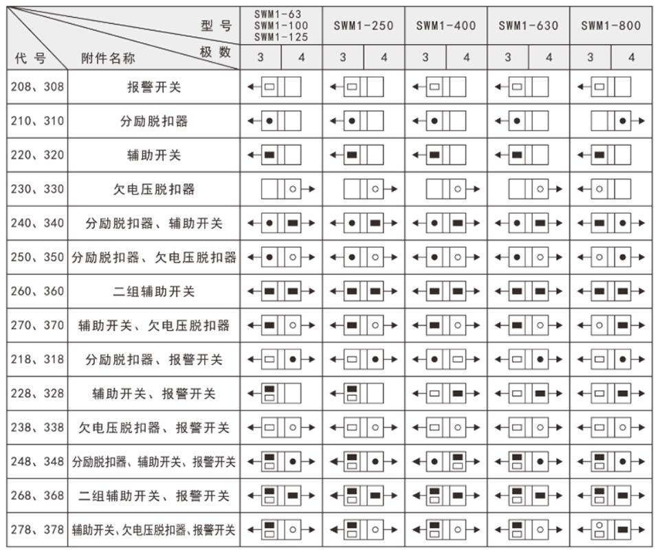 4.对SWM1-63、100、125、250产品中的220、320、240、340、270、370规格中辅助开关可供二对触头(即二常开、二常闭),260、360可供三对触头(即三常开、三常闭),但订货时需要注明。