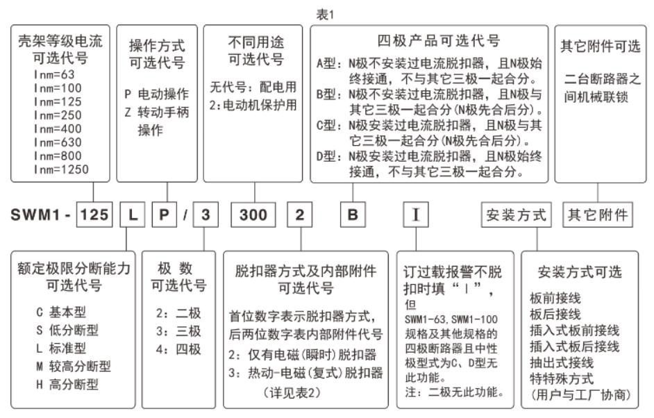 1、如订SWM1-125M三极,电动机保护用,额定电流为80A,并带分励脱扣器、辅助触头、板前接线且要求两台带机械联锁机构,即写为订SWM1-125M/33402,In=80A,板前接线2台机械联锁,分励脱扣器电压AC220V。如订SWM1-250四极,配电用,额定电流为180A,并带有电动操作机构及分励脱扣器,N极不安装过电流脱扣器,且N极与其它三极一起合分形式,板后接线10台。即写为订SWM1-250P/4310,In=180A,板后接线10台,电操电压:AC220V,分励脱扣器电压:AC220V。